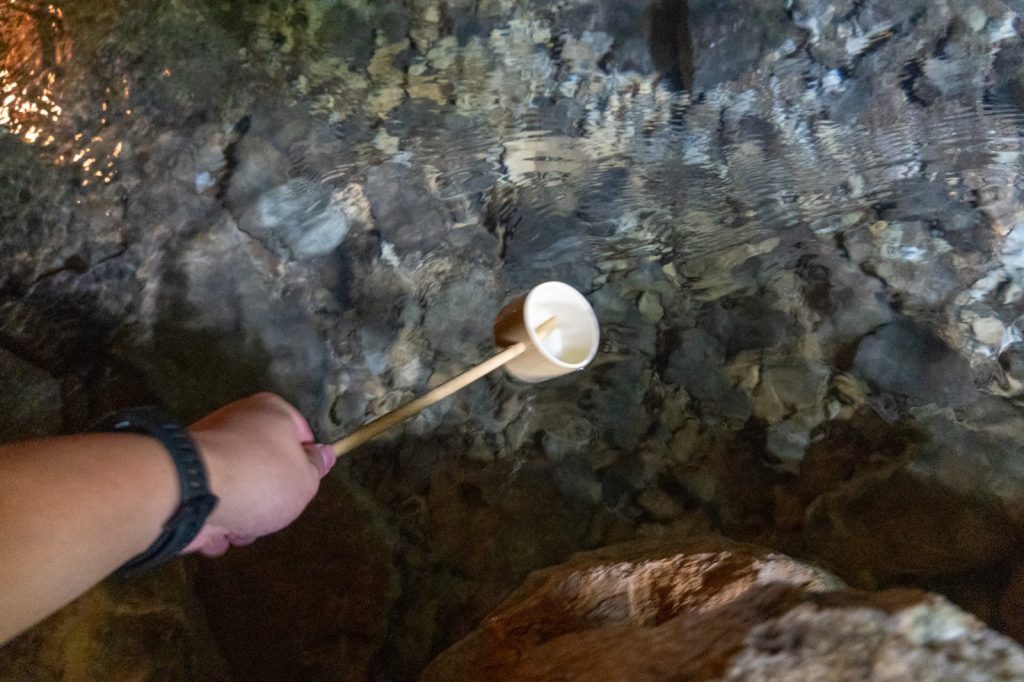 洞内に進むと、すぐにまた飲み水スポットが登場。なんと通路脇を流れる清流から、ひしゃくで直接水を汲んで飲むことができるんです。キンキンに冷えた湧水は雑味がなく、驚くほど美味しい!