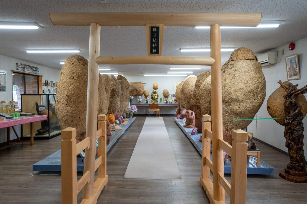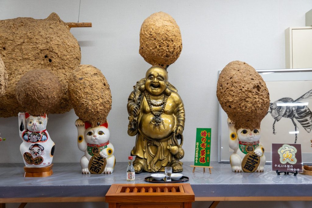 室内に鳥居と並べられた蜂の巣群。