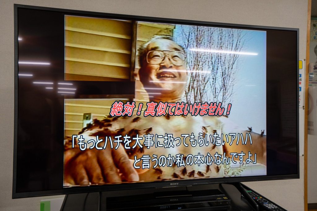 壁際のモニターでは、彼の語る「蜂と人間の共存」ドキュメンタリーが延々と再生中。