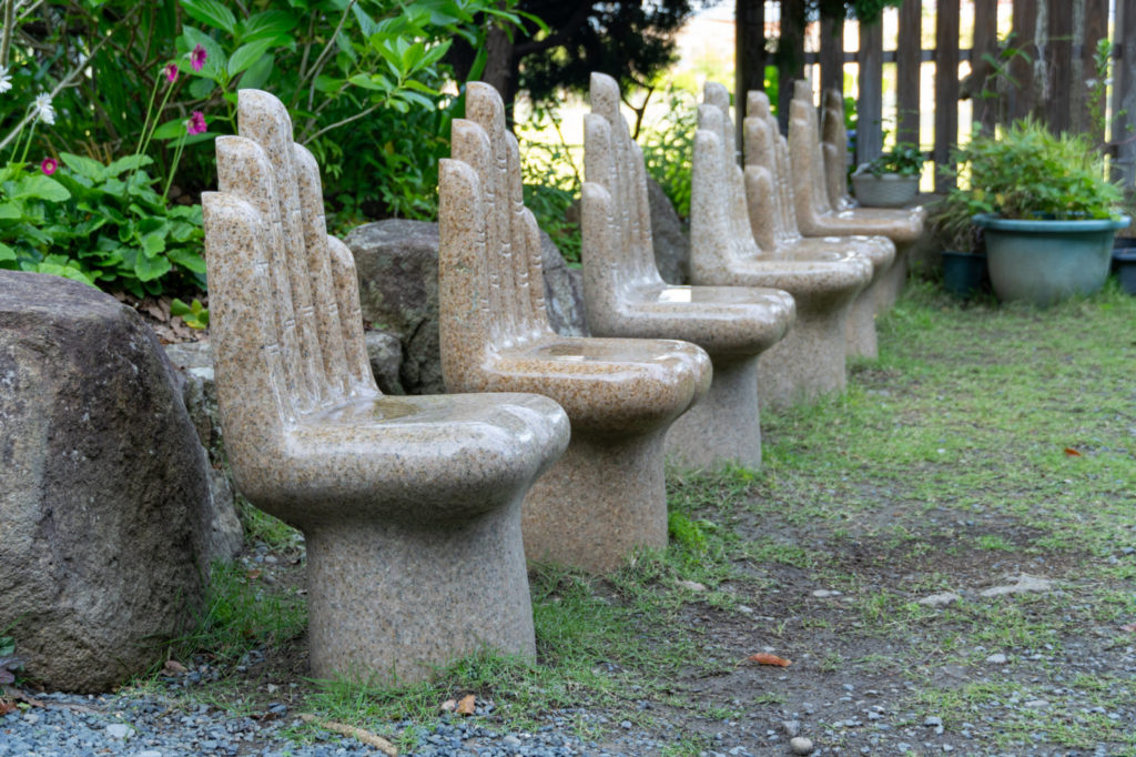 敷地に入ると、まず目に飛び込んでくるのが手の形をした椅子。なかなかのインパクト!しかも右手と左手のペアになってるのが地味にツボです。のっけから変なセンスを発揮していて、俄然、なかの展示にも期待が高まります。