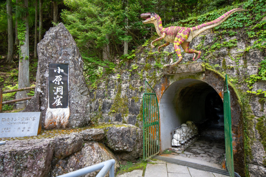 小原洞窟恐竜ランドは、和歌山県かつらぎ町にある観光施設。昭和37年(1962年)まで鉱山として使われていた坑道を活用したテーマパークで、恐竜の模型を設置した「恐竜ランド」と、極楽・地獄の世界を再現した「極楽洞」の2エリアがあります。