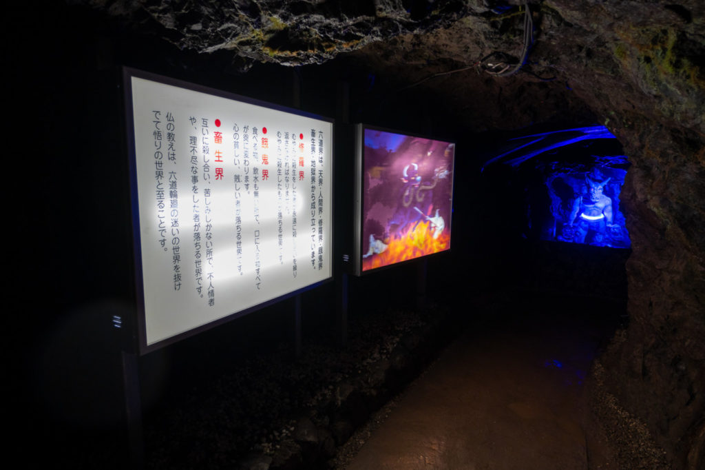 地獄エリアでは、「地獄界・餓鬼界・畜生界・修羅界」などの十界の考え方や、血の池地獄・針山といった地獄の種類を学べます。